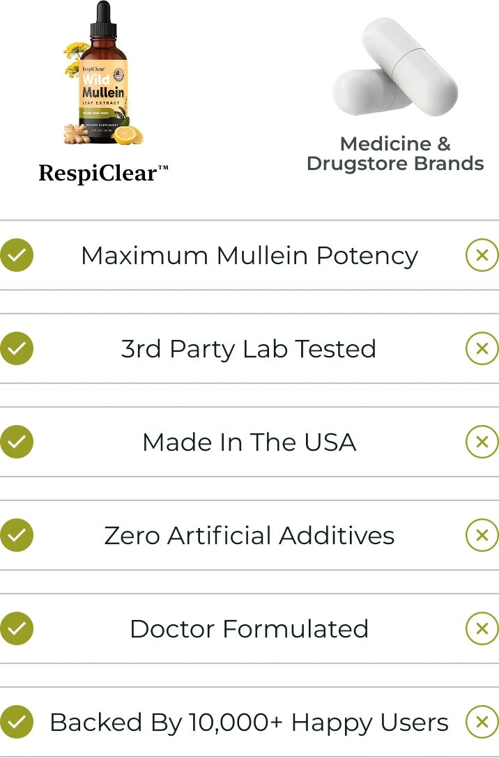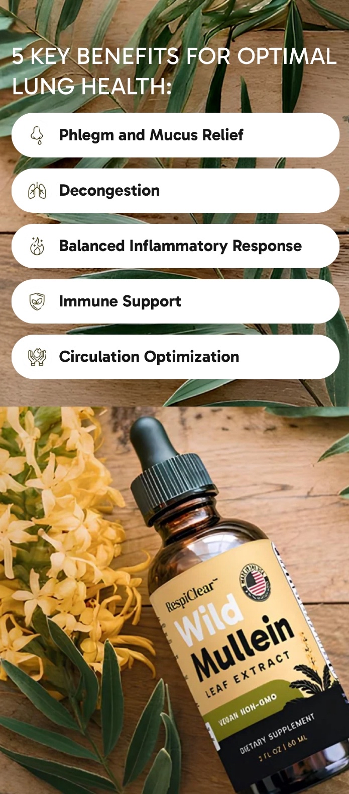 Most lung supplements underdose mullein — the one herb that actually clears you out. RespiClear delivers a high-potency liquid extract of wildcrafted mullein — not weak powders, not fillers.
