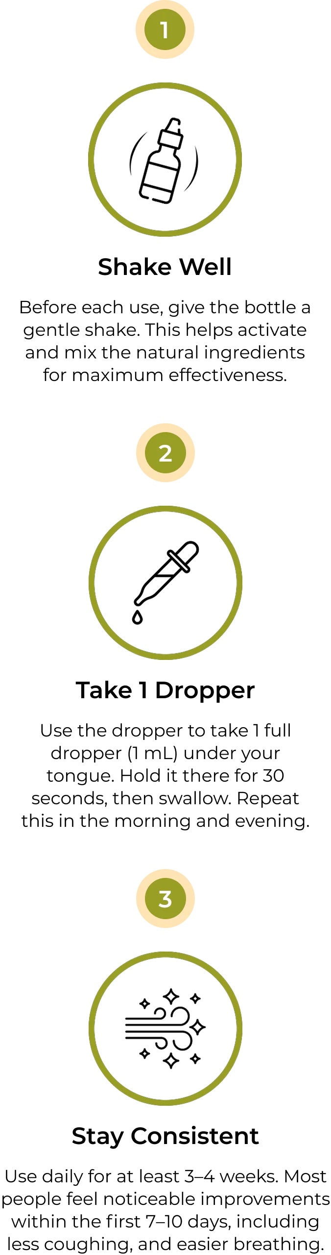 Most people begin to feel a difference within 7 to 10 days—things like lighter breathing, less chest tightness, or fewer coughing fits. Deeper results (like better stamina or clearer lungs) tend to show after 3–4 weeks of consistent use. Many of our customers say they feel like “they can breathe again.”